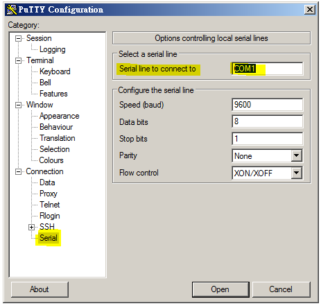 3. Select “Serial” under Connection > Enter COM port number under” Serial line to connect to”.